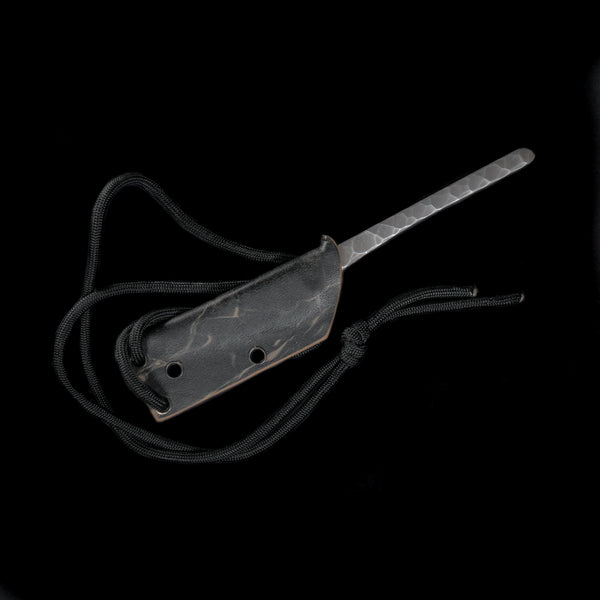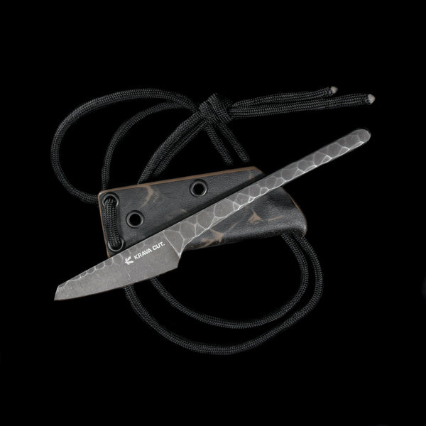 Загальна довжина - 140 мм Довжина клинка - 53 мм Товщина леза - 4 мм Конструкція - Full tang Сталь - інструментальна сталь D2 Твердість - 60HRC Оздоблення леза - Blackwash Ручка - почорніла з кам'яною структурою Чохли - шийні піхви Kydex Країна походження - Україна