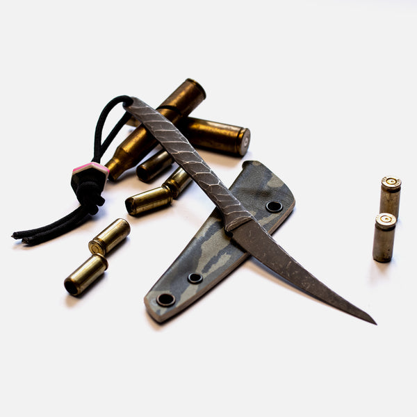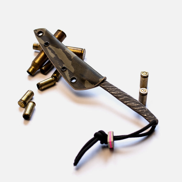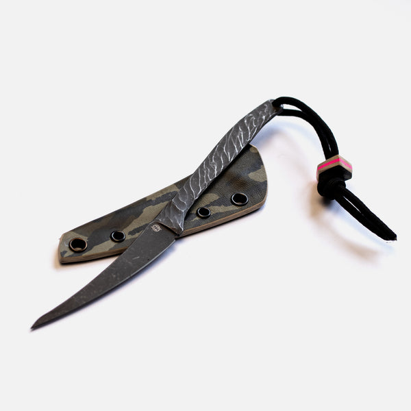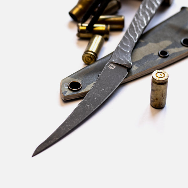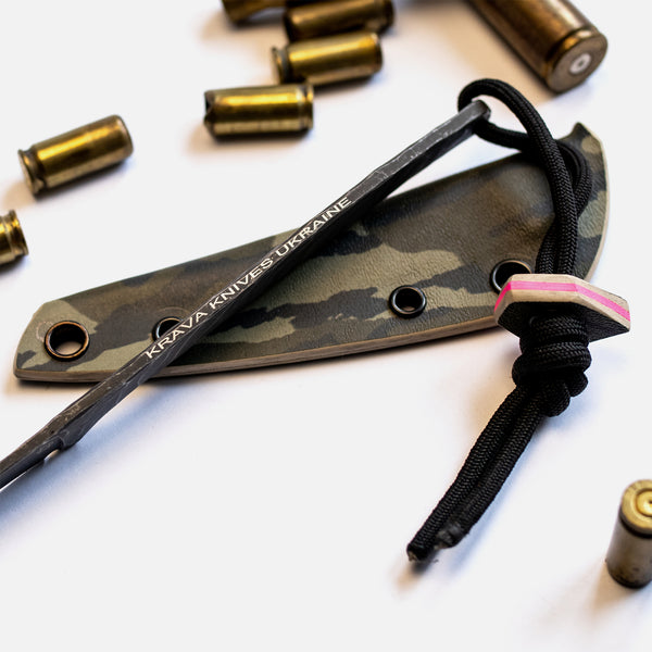 Загальна довжина - 186 мм Довжина клинка - 80 мм Товщина леза - 3 мм Конструкція - Full tang Сталь - інструментальна сталь D2 Твердість - 60HRC Оздоблення леза - Blackwash Ручка - почорніла з кам'яною структурою Чохли - шийні піхви Kydex Країна походження - Україна