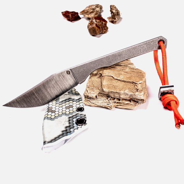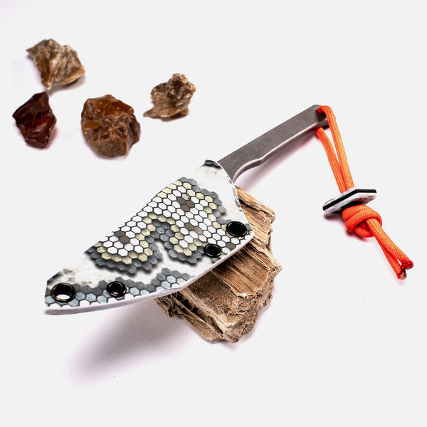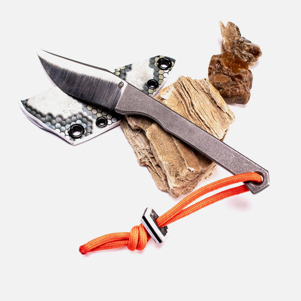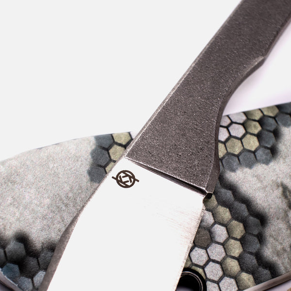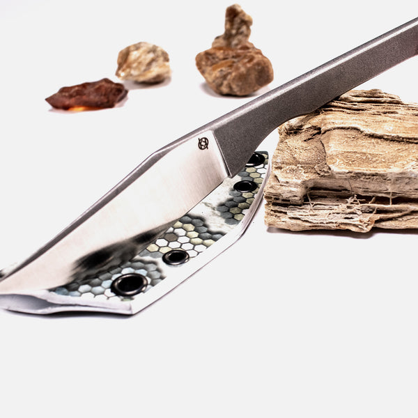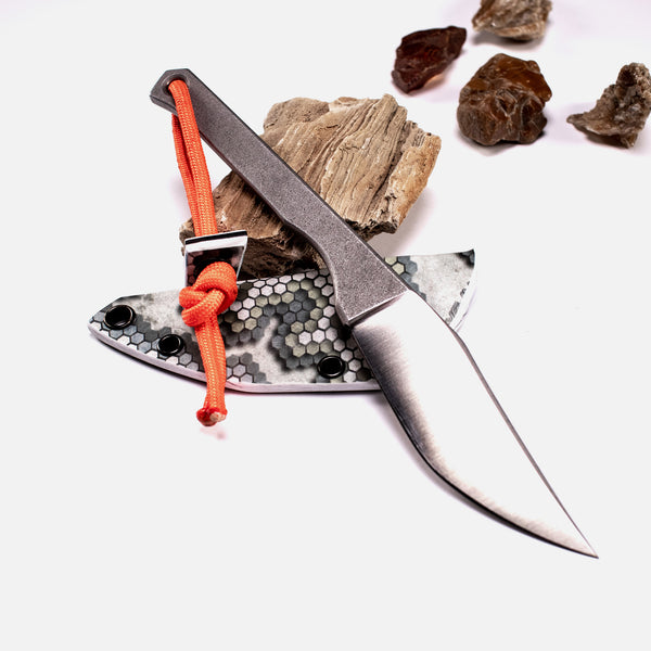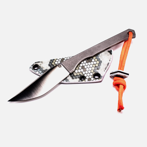 Загальна довжина - 175 мм Довжина клинка - 76 мм Товщина леза - 3 мм Конструкція - Full tang Сталь - нержавіюча сталь Bohler N690 Твердість - 59HRC Оздоблення леза - сатин. Ручка - Скелетована ручка з обробленим каменем. Чохли - піхви Kydex. Шаблон Макалу Hexcam Країна походження - Україна