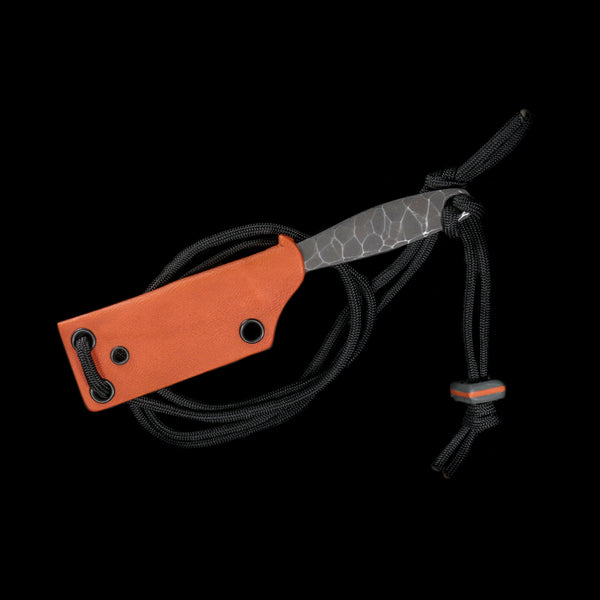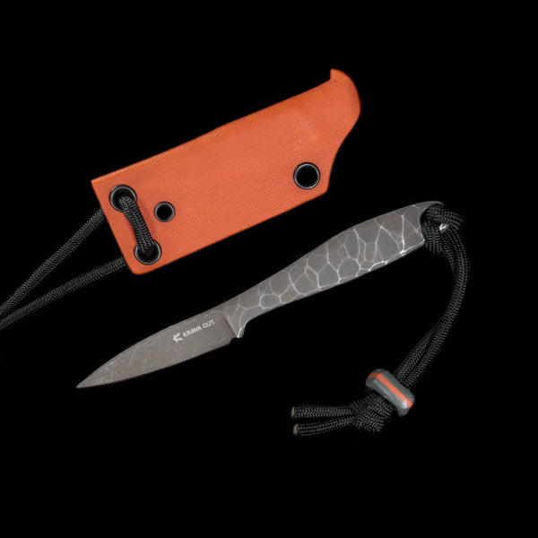 Загальна довжина - 130 мм Довжина клинка - 55 мм Товщина леза - 3 мм Конструкція - Full tang Сталь - інструментальна сталь D2 Твердість - 60HRC Оздоблення леза - Blackwash. Ручка - почорніла з кам'яною структурою Чохли - шийні піхви Kydex Країна походження - Україна
