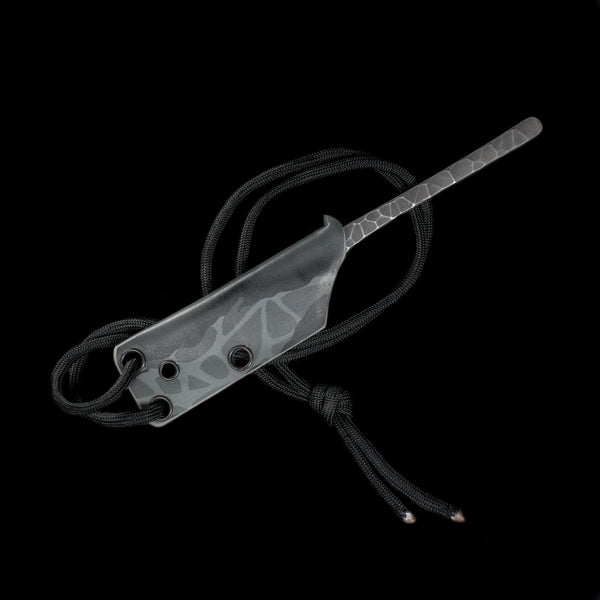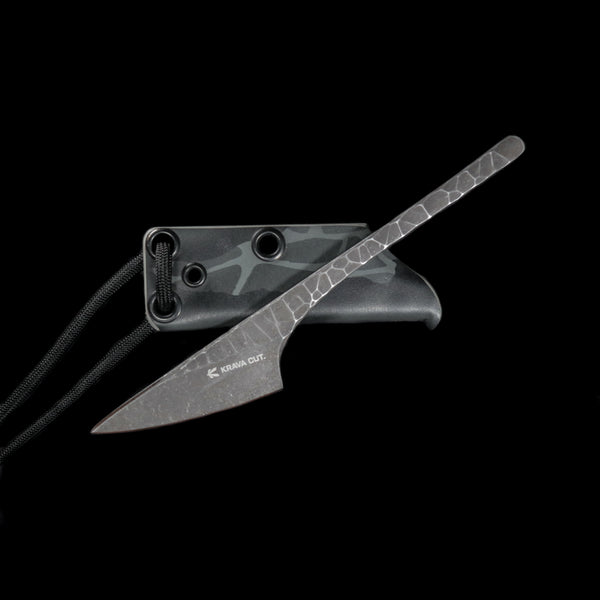 Загальна довжина - 150 мм Довжина клинка - 55 мм Товщина леза - 4 мм Конструкція - Full tang Сталь - інструментальна сталь D2 Твердість - 60HRC Оздоблення леза - Blackwash Ручка - почорніла з кам'яною структурою Чохли - шийні піхви Kydex Країна походження - Україна