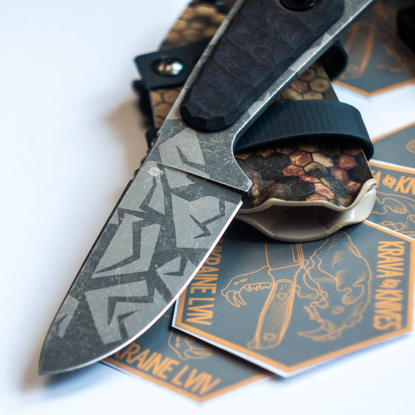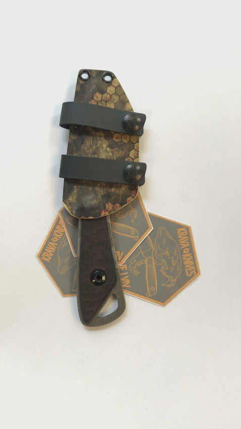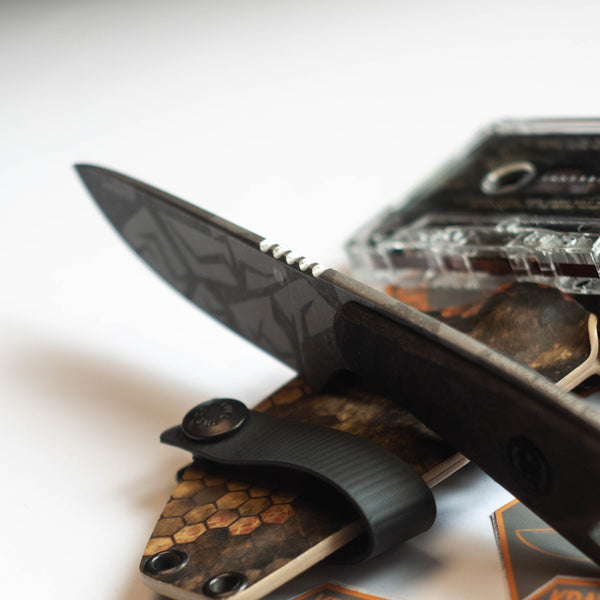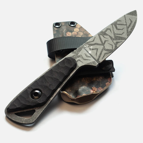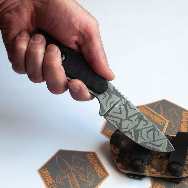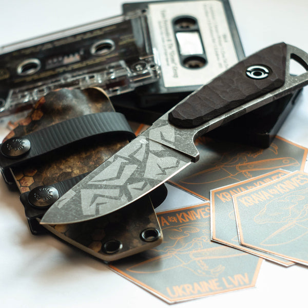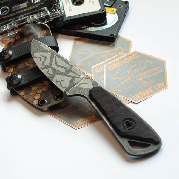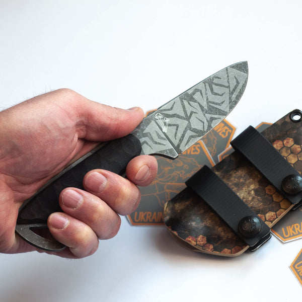 Загальна довжина - 205 мм (8 5/64 дюйма) Довжина леза - 87 мм (3 27/64 дюйма) Товщина леза - 4 мм (0,15 дюйма) Конструкція - Full tang Сталь - інструментальна сталь D2. Твердість - 60-61HRC Вага без футляра - 146 грамів (5,15 унцій) Оздоблення леза - Blackwash Ручка - Скелетна ручка з кам'яною структурою Чохли - кайдекс, шийні піхви з ремінцем для кріплення на поясі. Країна походження - Україна