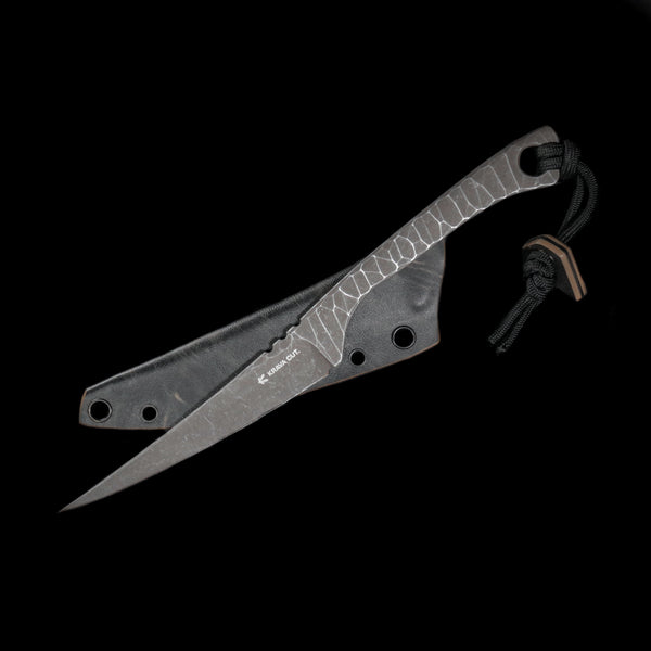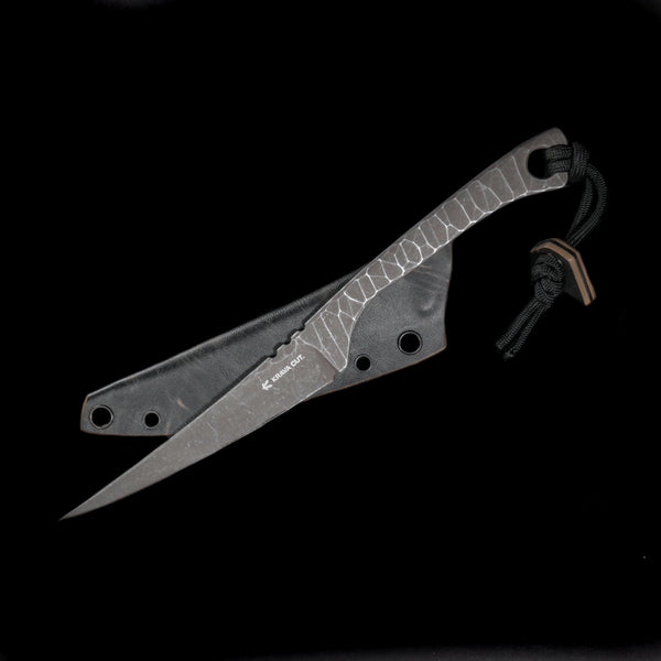 Загальна довжина - 215 мм Довжина клинка - 105 мм Товщина леза - 4 мм Конструкція - Full tang Сталь - інструментальна сталь D2 Твердість - 60HRC Оздоблення леза - Blackwash Ручка - почорніла з кам'яною структурою Чохли - піхви Kydex Країна походження - Україна