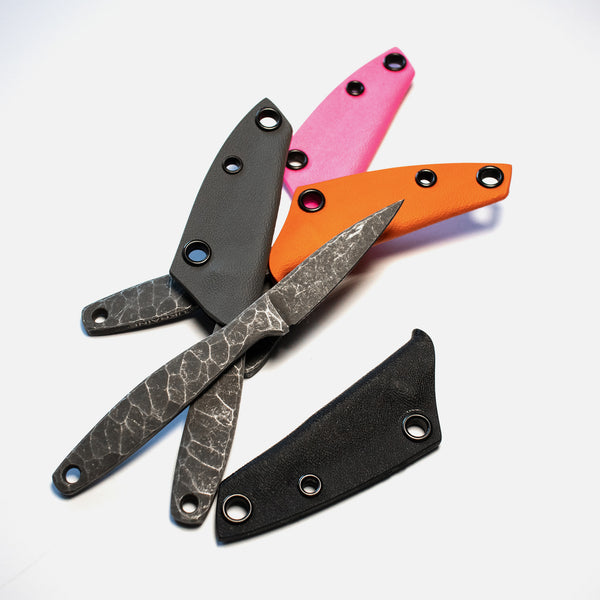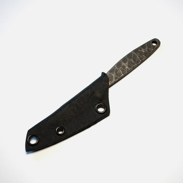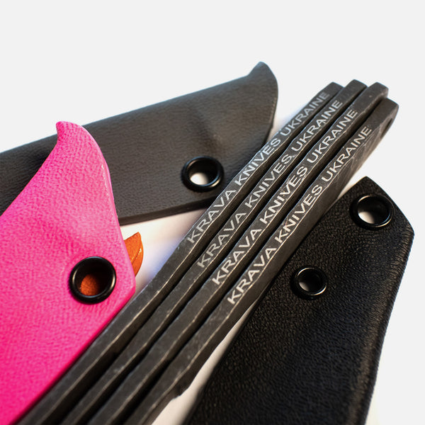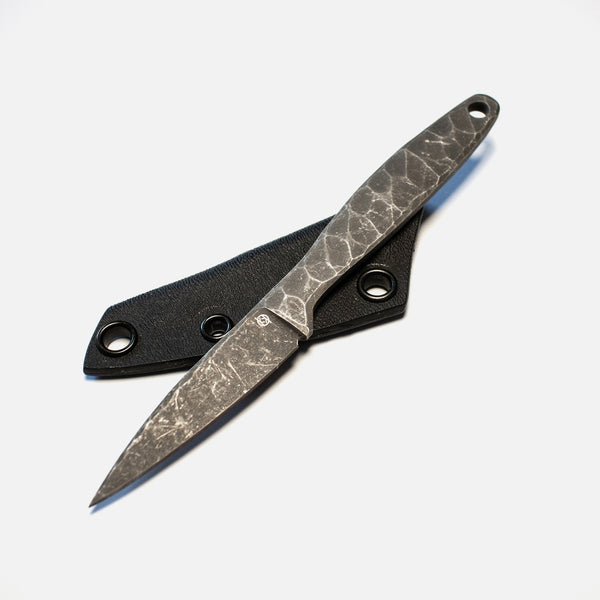 Загальна довжина - 128 мм Довжина клинка - 52 мм Товщина клинка - 2,8 мм Конструкція - Full tang Сталь - інструментальна сталь D2. Твердість - 60-61HRC Оздоблення леза - Blackwash Ручка - конструкція з чорного каменю Чохол - кайдекс Країна походження - Україна
